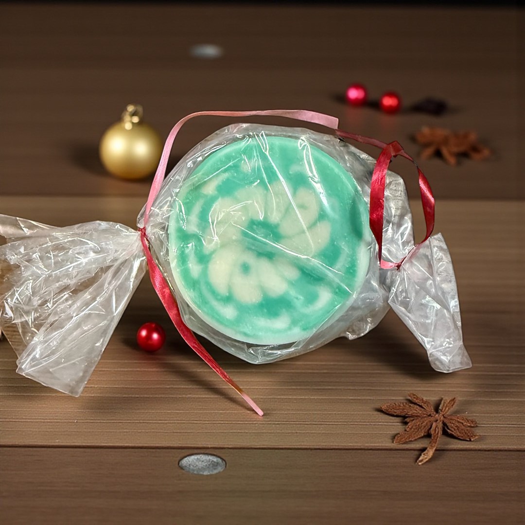 These fun round cold processed soaps are scented in one or four different scents, peppermint, candy cane, spearmint and cranberry
