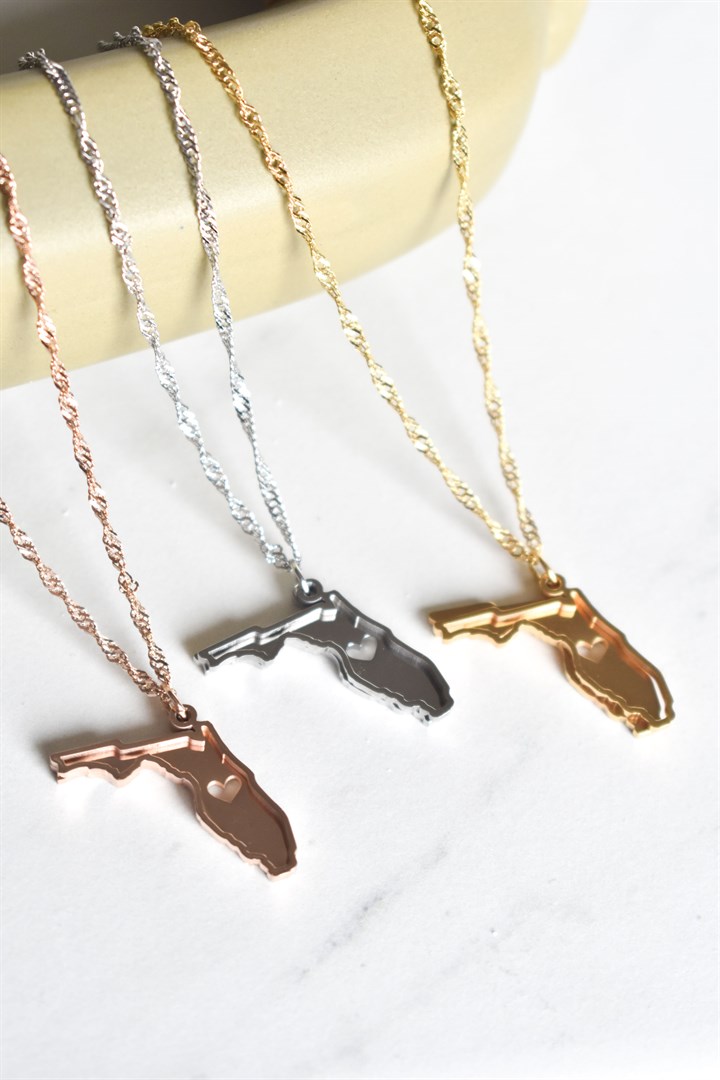 A two-layer state-shaped pendant designed to celebrate your identity. The first layer features a solid, filled-in state shape with a charming hollow heart, while the second layer showcases an elegant outline of the state. When combined, these layers create a distinctive and meaningful design that beautifully represents your connection to your state. Paired with a stunning spiral-patterned chain in a color of your choice, this unique piece makes a stylish and personal statement.