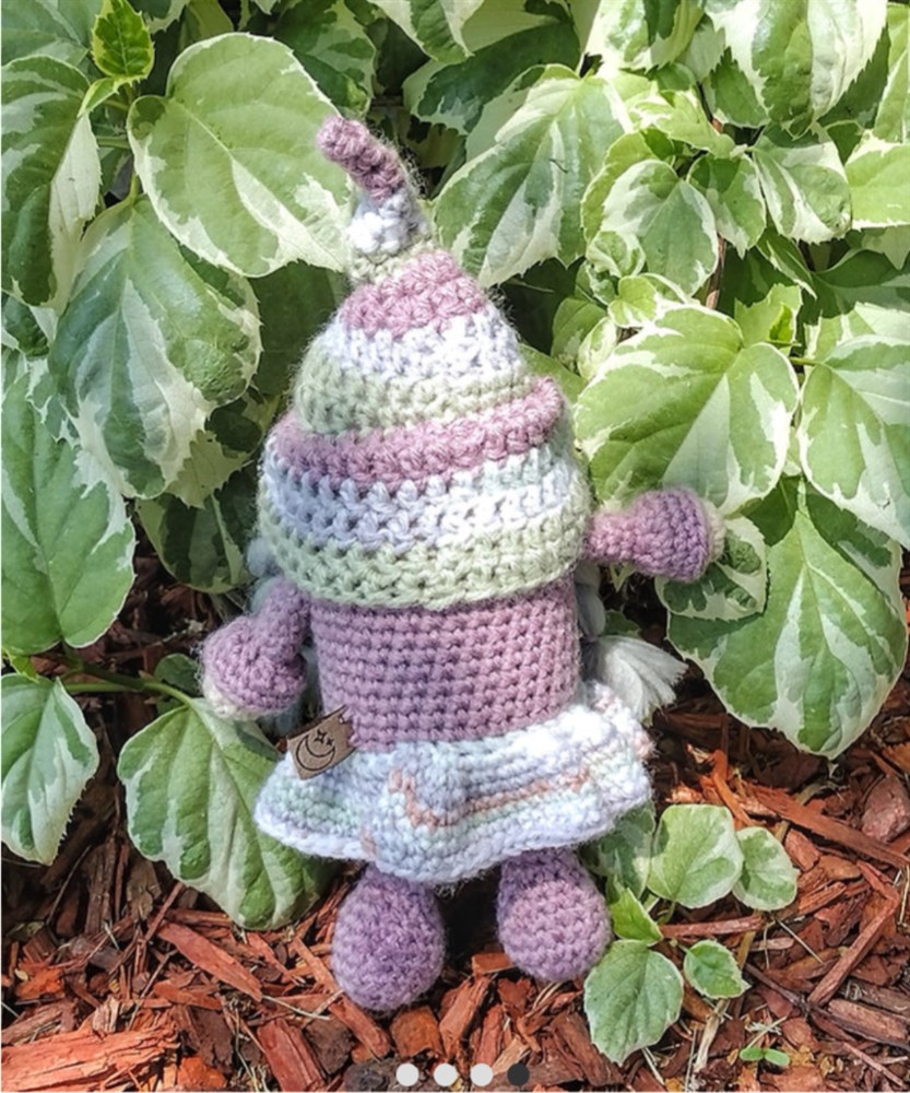 Mother Gnome is a sweet little character you’ll instantly fall in love with from her color scheme of greens, purples, and earthtones, to her buttoned pinafore, ruffly skirt, and her stylish braids. Give her to someone you cherish or find her a perfect spot in your own home.