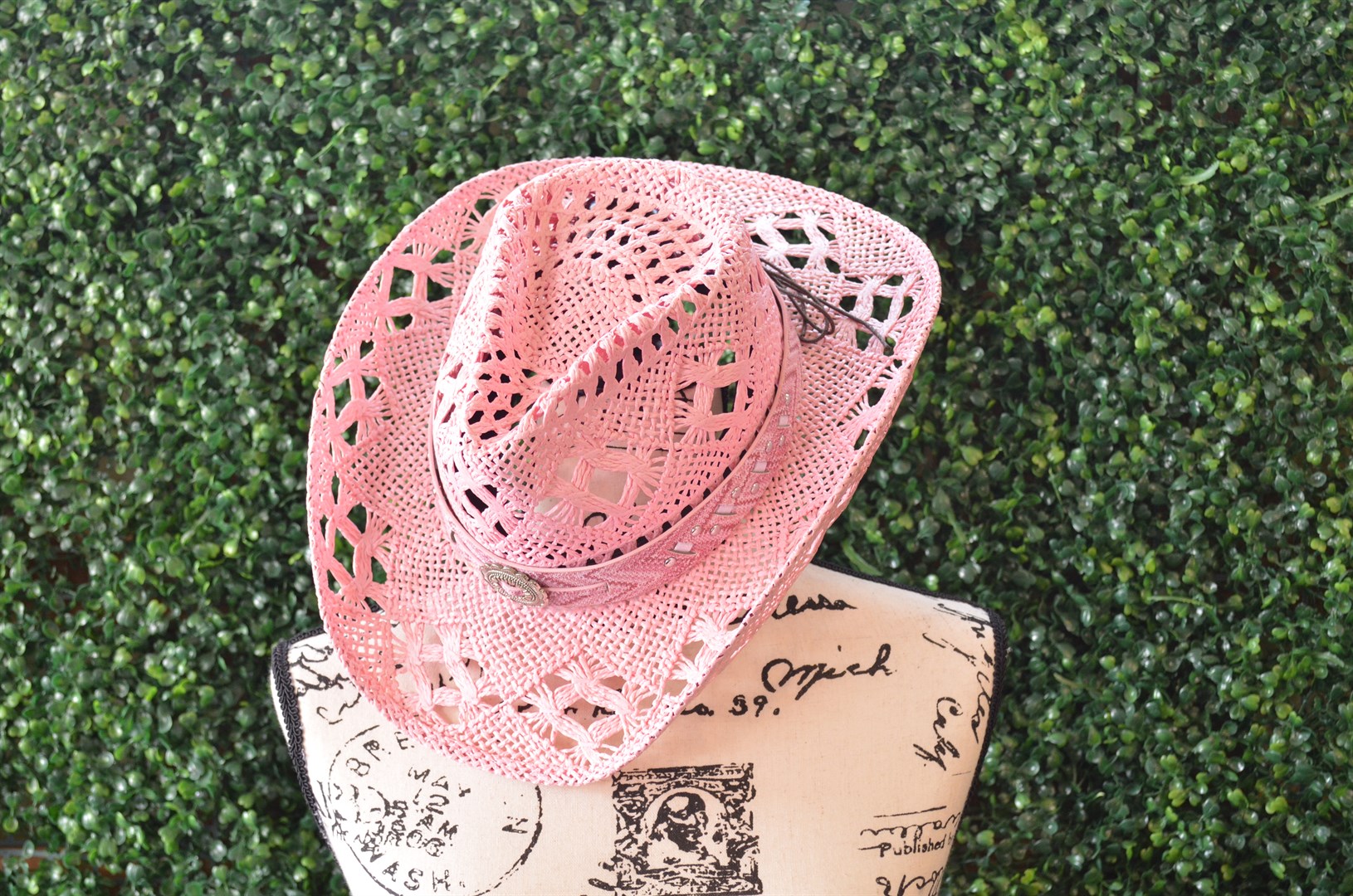 Pink straw cowboy hat with pink woven hat and with silver concho