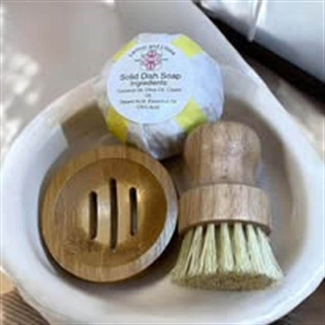 This solid dish comes with a soap dish and brush, scented with Lemon and Litsea essential oil for a nice clean scent