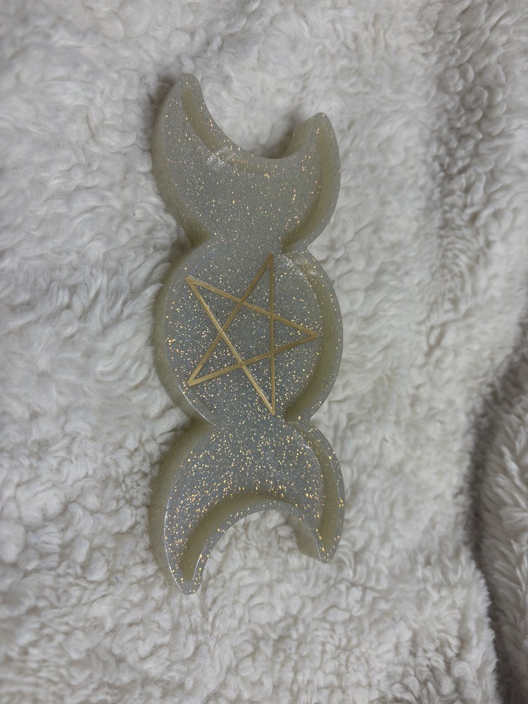This tray is 6 x 2.5 x .5 it is great for display or to place small items in or what ever you can think to use it for. It is a resin tray made with white glitter with a gold star in the center of it.